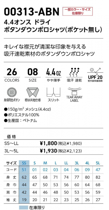 ・襟は共地仕様、見頃同色ボタン、スリットあり、UVカット、UPF20(紫外線保護指数)